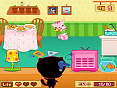 Avoid items the mouse is throwing and carry cookies from the box on the right to the respective plates on the table.