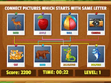 Kindergarten Activity 1 est un excellent jeu pour débuter l'apprentissage de l'alphabet pour les jeunes enfants. Chaque image porte son nom en dessous. Il suffit d'associer les images contenant des illustrations qui commencent par la même lettre. Réalise les associations en cliquant/touchant une image et en faisant glisser la ligne vers l'image correspondante. Termine un niveau en moins de 2 minutes pour obtenir un bonus. Gagne 500 points pour les associations correctes ou une pénalité de 100 points pour les mauvaises associations. Termine les 12 niveaux pour gagner la partie. Amuse-toi à jouer à ce jeu pour enfants ici sur Y8.com !
