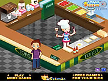 Your goal is to serve the customers. Cook sandwiches, prepare coffee, milk and fruit shakes. Be careful not to overcook the bread and the eggs. Click on the sandwich first then egg and ketchup to finish preparing the sandwiches. For the shakes, drag the fruits into the blender.